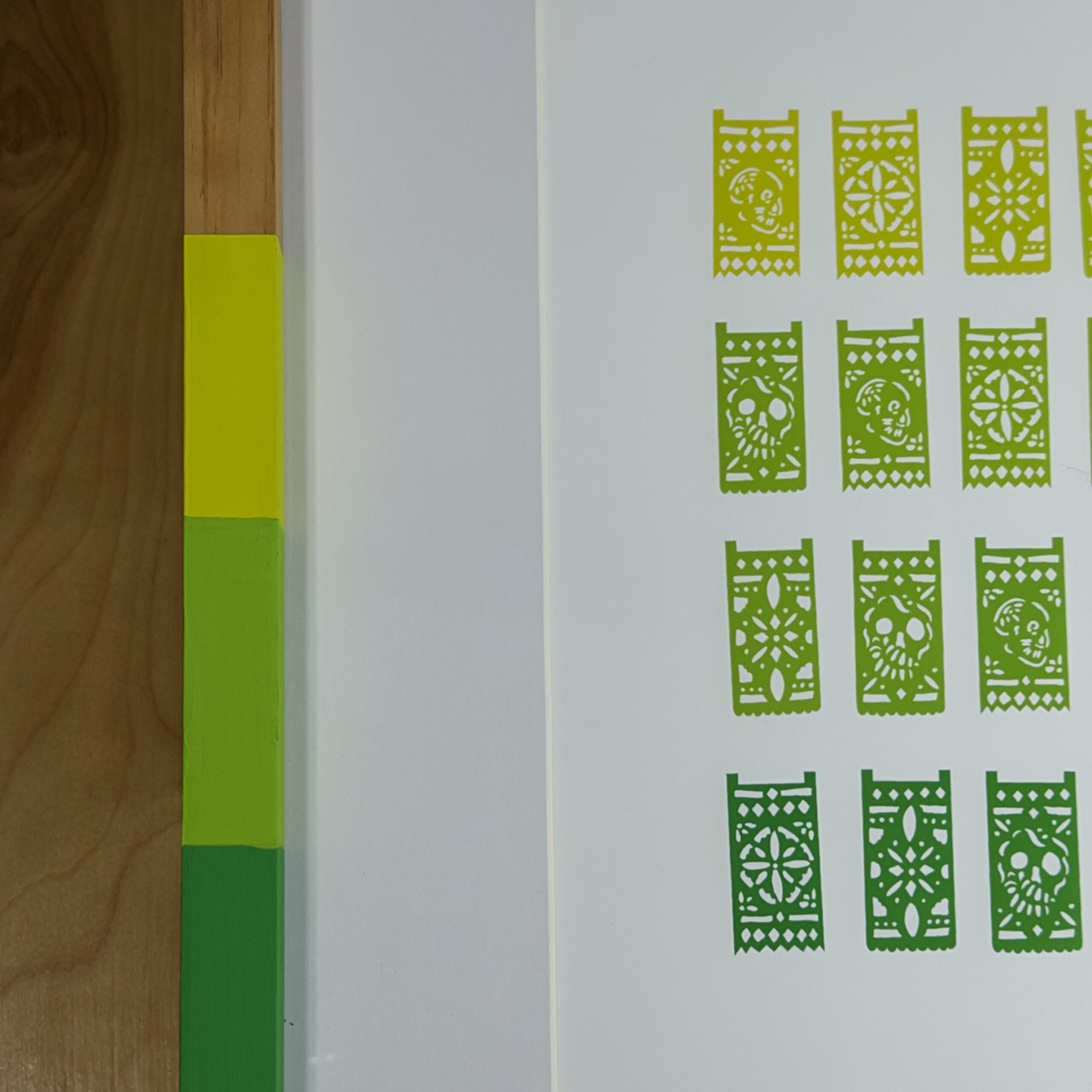 Colorful papel picado patterns designed by the artist.